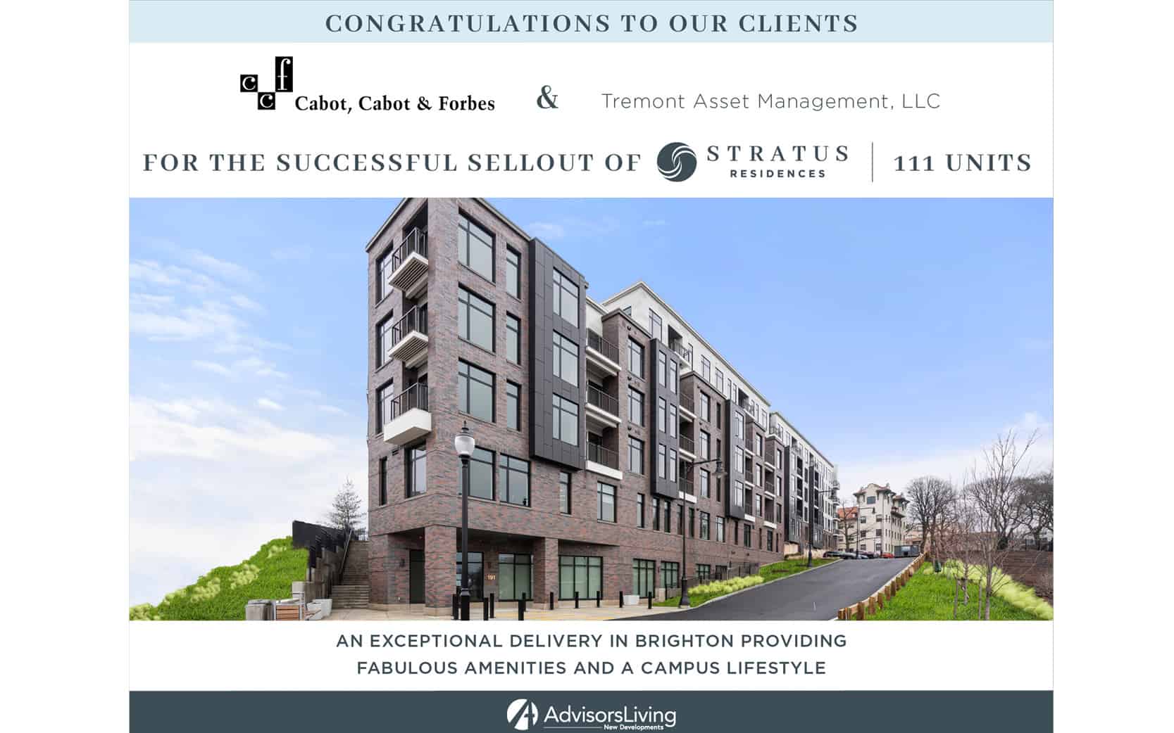 Boston – Advisors Living, the residential real estate sales platform associated with Boston Realty Advisors, the largest Boston-based independent commercial real estate and consulting firm, has sold all 111 luxury living units in Stratus Residences, on the inviting 12-acre campus in Brighton.
